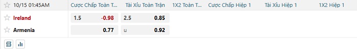 Bảng tỷ lệ kèo bóng đá Ireland vs Armenia