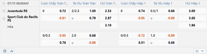 Bảng tỷ lệ kèo nhà cái Juventude vs SC Recife