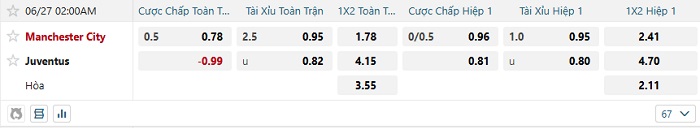 Bảng tỷ lệ kèo bóng đá hôm nay Juventus vs Man City