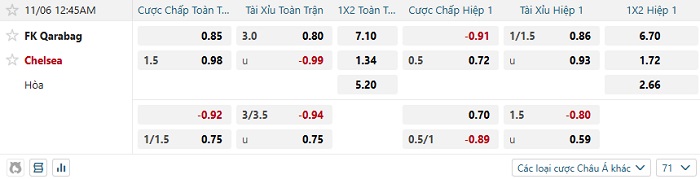 Hiện tại, nhà cái đang niêm yết cho Chelsea mức chấp -1 1/2 và họ hoàn toàn đủ tự tin có cho mình 3 điểm. Trong 6 trận đấu gần nhất của Chelsea, họ chỉ có 1 trận thua và còn lại toàn thắng cả 5 trận. Trong khi đó thì 5 trận đấu đã qua của Qarabag, đội bóng này chỉ có 1 thắng, 1 hòa và thua đến 3 trận. Do đó, kèo chấp châu Á trận đấu hôm nay sẽ có đội khách Chelsea là lựa chọn an toàn nhất.