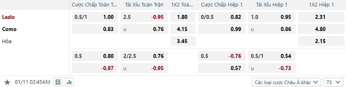 Bảng tỷ lệ kèo bóng đá Lazio vs Como