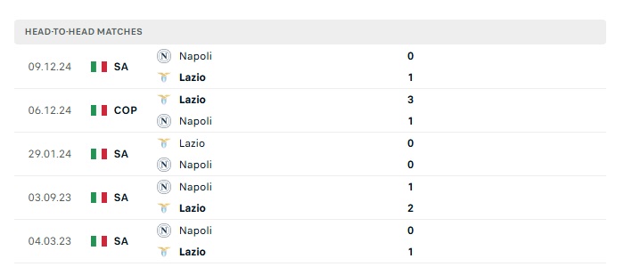- Kèo tỷ số H2 Lazio vs Napoli: 0-1