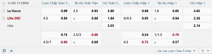 Bảng kèo bóng đá Le Havre vs Lille