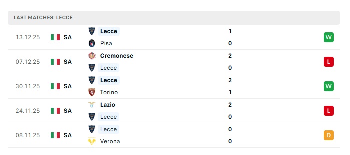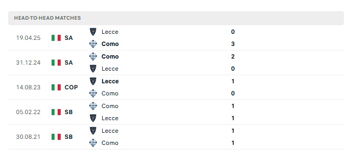Tất nhiên, sẽ không có gì bất ngờ khi phong độ thi đấu của hai đội đang có sự chênh lệch không nhỏ. Với Lecce, họ đang chỉ có được 2 thắng, 2 thua và 1 hòa trong 5 trận gần nhất của mình. Trong khi đó thì Como đã thắng 3, hòa 2 và chỉ thua 1 trong 6 trận đấu gần nhất. Thế nên, sẽ không có gì bất ngờ khi mà trận đấu hôm nay sẽ khép lại với 3 điểm dành cho đội khách, hoặc ít nhất họ cũng sẽ có 1 điểm.