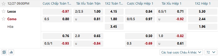 - Kèo tỷ số H1 Lecce vs Como: 0-1