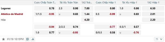 Bảng tỷ lệ kèo bóng đá Leganes vs Atl Madrid