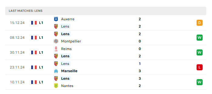 Phong độ gần đây Lens vs PSG