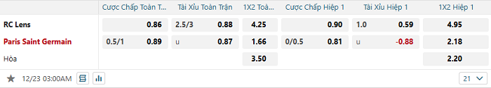 Bảng tỷ lệ kèo bóng đá Lens vs PSG