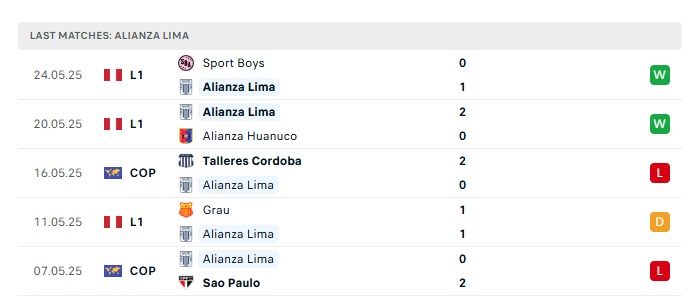 - Phong độ gần đây Alianza Lima