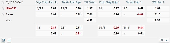 Bảng tỷ lệ kèo bóng đá Lille vs Stade Reims