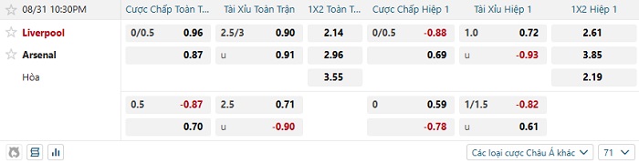 Bảng tỷ lệ kèo bóng đá hôm nay Liverpool vs Arsenal