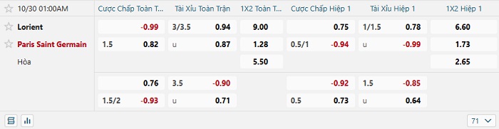 Bảng tỷ lệ kèo bóng đá hôm nay Lorient vs PSG