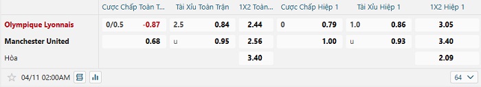 Bảng tỷ lệ kèo bóng đá hôm nay Lyon vs Man Utd