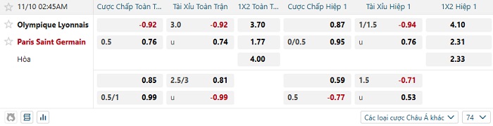 Bảng tỷ lệ kèo bóng đá hôm nay Lyon vs PSG