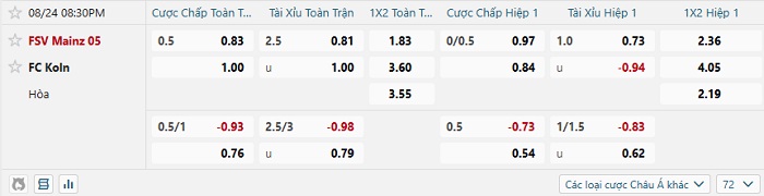 Bảng tỷ lệ kèo nhà cái Mainz vs FC Koln