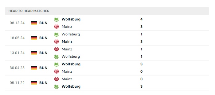 Lịch sử đối đầu Mainz vs Wolfsburg