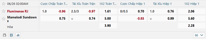 - Kèo tỷ số H2 Mamelodi Sun. vs Fluminense: 1-1