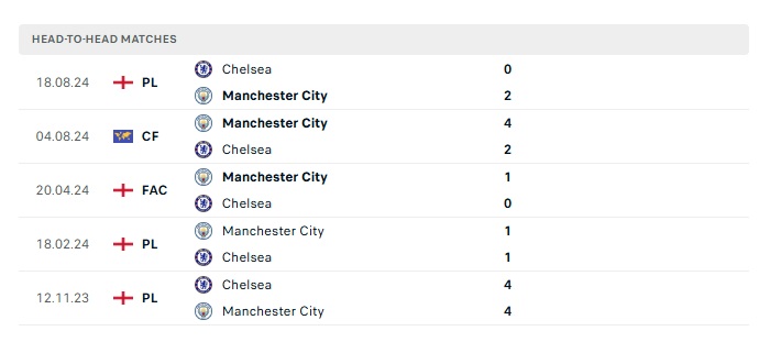 Lịch sử đối đầu Man City vs Chelsea