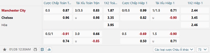 • Kèo tỷ số H1 Man City vs Chelsea: 0-0