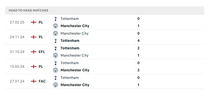 Lịch sử đối đầu Man City vs Tottenham
