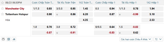 Soi kèo châu Á, kèo Man City vs Tottenham