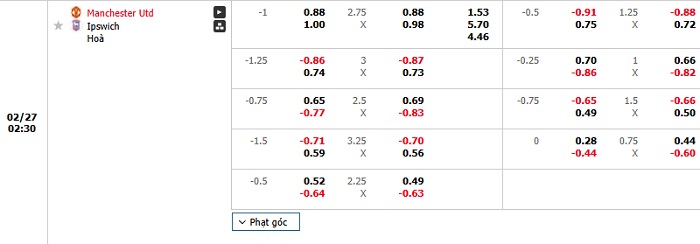Bảng tỷ lệ kèo bóng đá Man Utd vs Ipswich