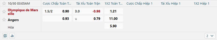 - Kèo tỷ số H1 Marseille vs Angers: 2-0