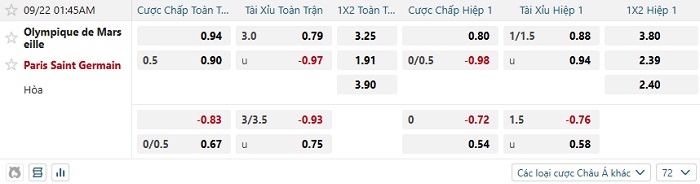 • Kèo tỷ số H1 Marseille vs PSG: 0-1