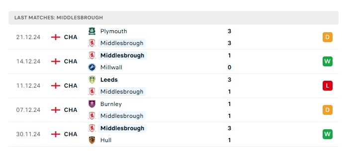 - Phong độ gần đây Middlesbrough