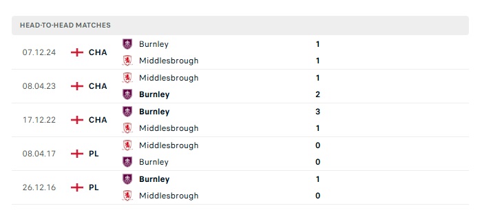 Lịch sử đối đầu Middlesbrough vs Burnley