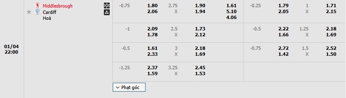 Bảng tỷ lệ kèo bóng đá Middlesbrough vs Cardiff City