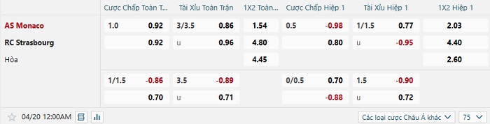Bảng tỷ lệ kèo bóng đá hôm nay Monaco vs Strasbourg