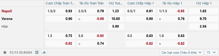 Bảng tỷ lệ kèo bóng đá Napoli vs Verona