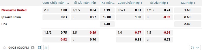 Bảng kèo bóng đá Newcastle vs Ipswich