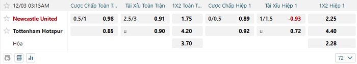 Bảng tỷ lệ kèo nhà cái Newcastle vs Tottenham