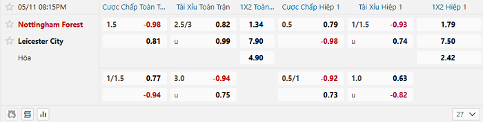 Bảng tỷ lệ kèo bóng đá Nottingham Forest vs Leicester City