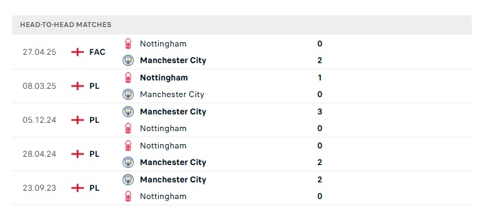 Lịch sử đối đầu Nottingham Forest vs Man City