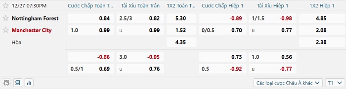 Bảng tỷ lệ kèo bóng đá Nottingham Forest vs Man City