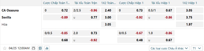 Bảng tỷ lệ kèo bóng đá Osasuna vs Sevilla