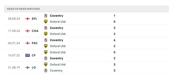 Lịch sử đối đầu Oxford Utd vs Coventry