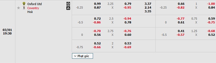 Bảng tỷ lệ kèo bóng đá Oxford Utd vs Coventry