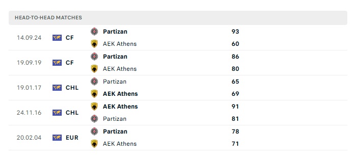 Lịch sử đối đầu Partizan vs AEK