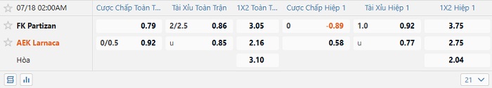 - Kèo tỷ số H2 Partizan vs AEK: 1-0