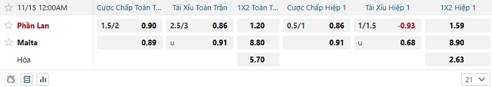 Bảng tỷ lệ kèo bóng đá hôm nay Phần Lan vs Malta