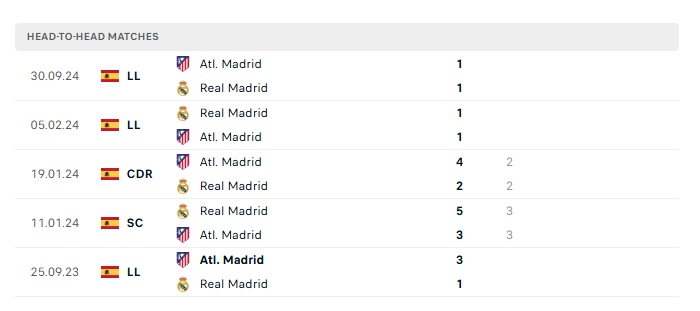 - Kèo tỷ số H2 Real Madrid vs Atletico Madrid: 1-0