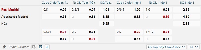 Bảng tỷ lệ kèo bóng đá Real Madrid vs Atletico Madrid