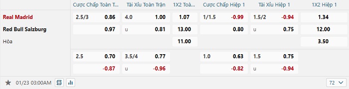 Bảng tỷ lệ kèo bóng đá Real Madrid vs RB Salzburg