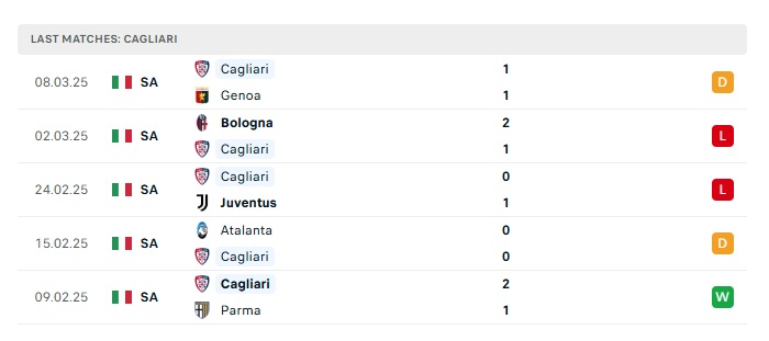 - Phong độ gần đây Cagliari