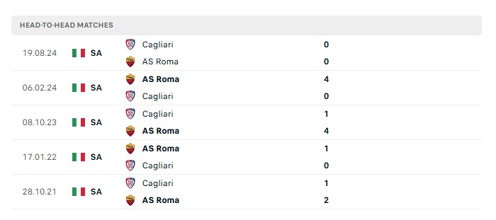 Lịch sử đối đầu Roma vs Cagliari