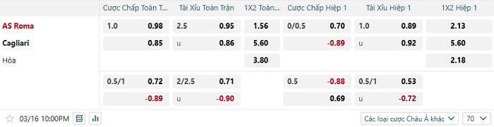 Bảng tỷ lệ kèo bóng đá Roma vs Cagliari